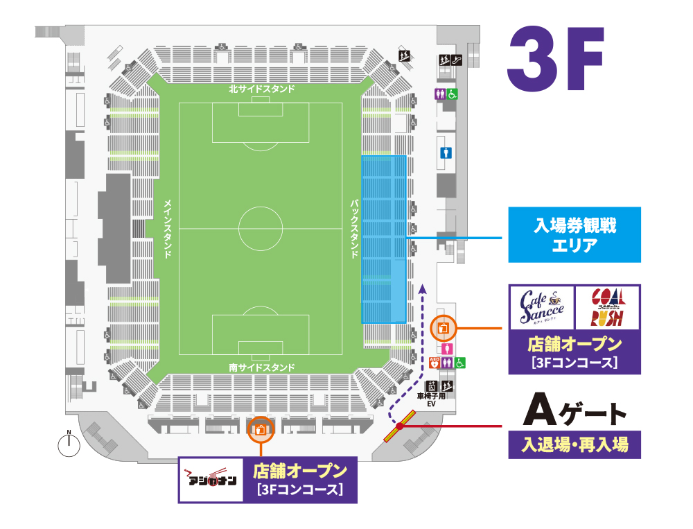 Aゲートからご入場いただき、バックスタンド1層目「観戦エリア」にて自由にお座りください。