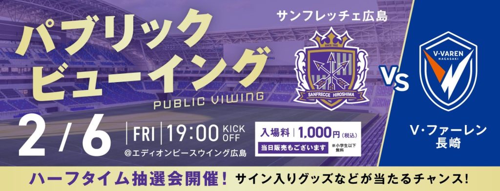 このたび、広島サッカースタジアム(エディオンピースウイング広島)指定管理者である株式会社サンフレッチェ広島は、2月6日(金)に行われる明治安田J1百年構想リーグ のアウェイ、V・ファーレン長崎戦において、エディオンピースウイング広島にてパブリックビューイングを開催することを決定しましたのでご案内いたします。