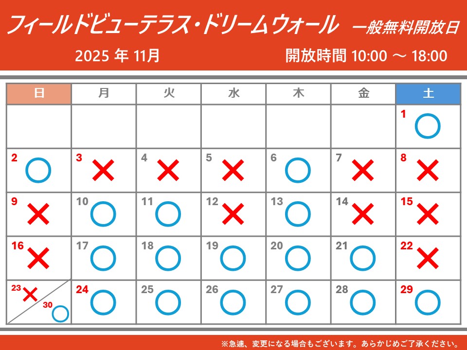 11月5日(水)フィールドビューテラス・ドリームウォール開放のお知らせ