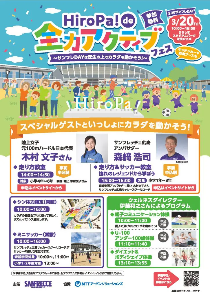 エディオンピースウイング広島では、3/20(金・祝)10時からHiroPa!公園エリアにて「【3.20サンフレの日】HiroPa! de 全力アクティブ・フェス!〜サンフレDAYは芝生の上でカラダを動かそう!〜」を開催します。