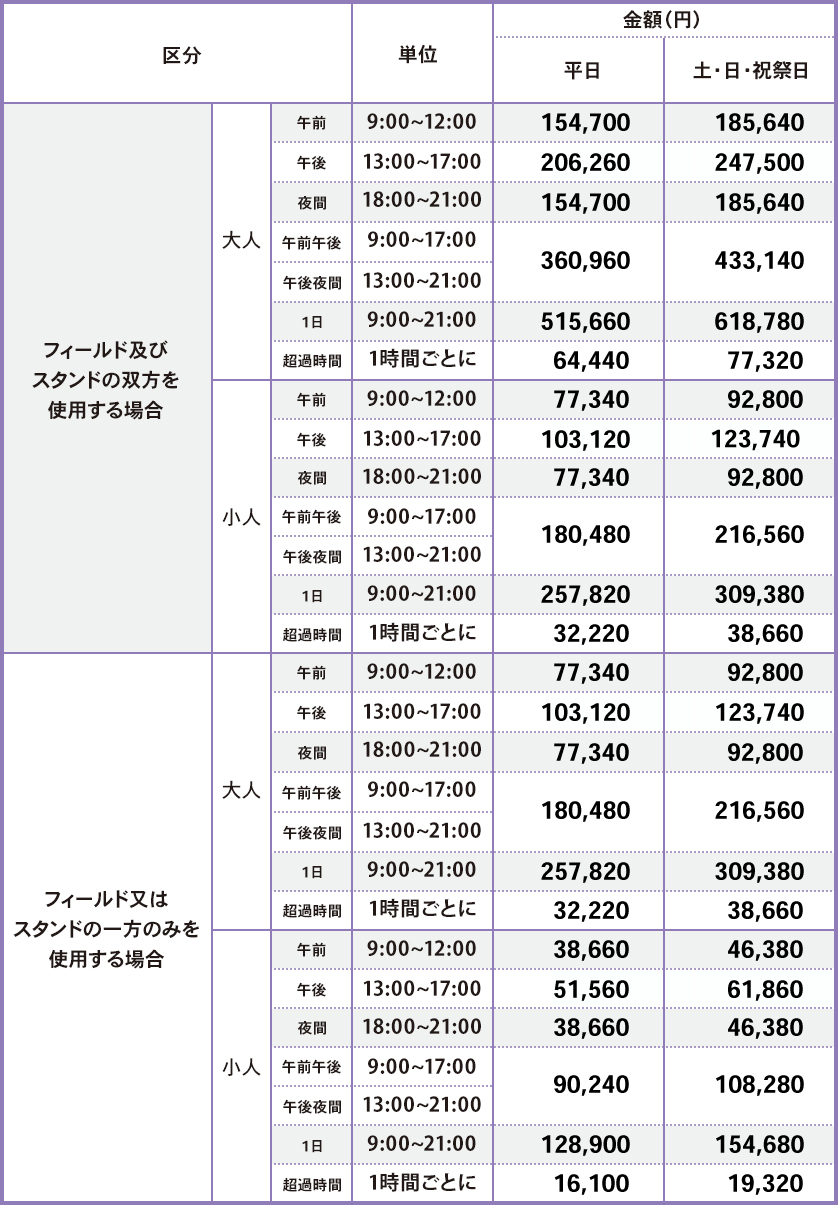 - (6)フィールド、スタンド以外の施設(諸室・付属設備等)を併せて利用する場合は、上記申込時、同時に受け付けます。